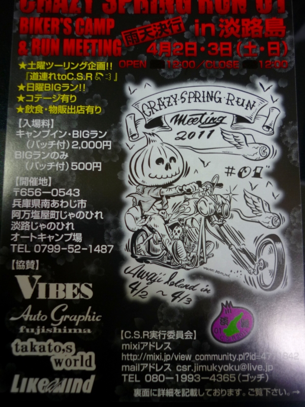 4/2.3(土・日)淡路島で行われる“CRAZY SPRING RUN”(C・S・R)は予定通り開催されると先日このブログで記載しましたが、