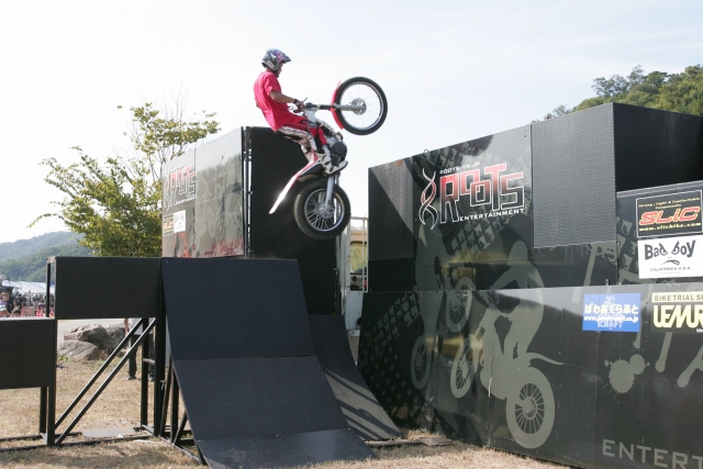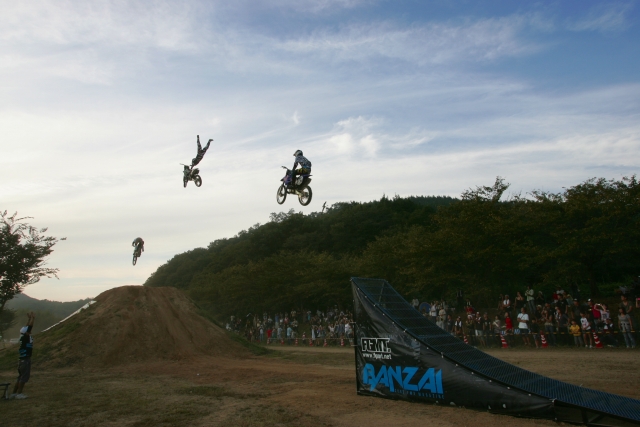 さすがです☆チャレンジしたのは、さぬきバイカーズミーティングでFMXのサポートをしているオンアンドオフタカマツさんの仲間のモトクロスライダーさん。そして今回さぬきバイカーズミーティングに出演のトライアルライダーROOTS ENTERTAINMENTの田中さん。)